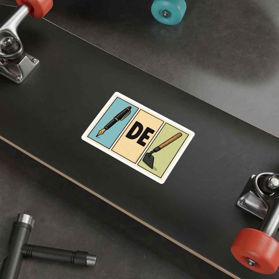 Small but expressive die-cut stickers that bring a warm, vintage indie vibe to laptops, journals, water bottles, and toolkits. Each sticker features three retro-panel illustrations — a fountain pen, the letters “DE,” and a garden trowel — rendered in soft, muted tones with a matte finish. The weather-resistant vinyl and UV laminate keep colors soft yet durable, while the easy-peel backing makes placement simple. These stickers suit makers who bridge studio work and hands-on projects: writers who garden, designers who DIY, and creatives who carry both pen and trowel through their day. Stick one on your laptop during a writing session, tuck another inside a sketchbook, or let it tag a toolbox. The design quietly celebrates the mix of thought and craft, and ages gently outdoors or indoors without harsh shine.